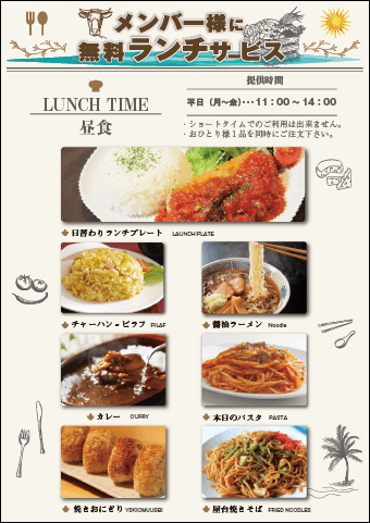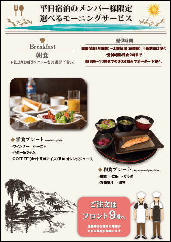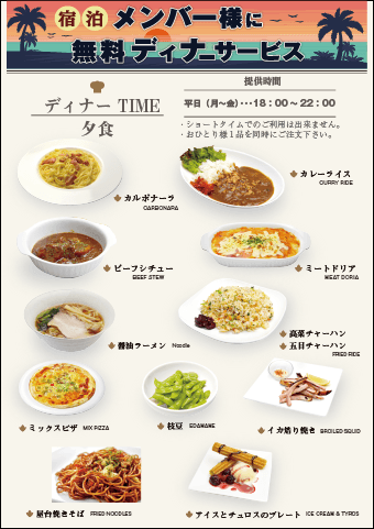 メンバーになると、館内でのお食事がとてもお得です。平日限定でランチ、ディナーを、宿泊の方にはモーニングを、おひとり様に1品をメンバー様専用で無料サービスさせていただきます。90分休憩のショートタイムでのご利用はできません。